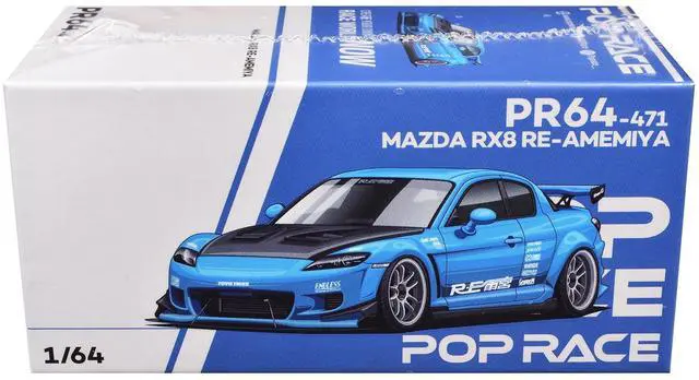 Brand new 1/64 scale diecast car model of Mazda RX8 RE Amemiya RHD (Right Hand Drive) Light Blue with Carbon Hood "Tokyo Auto Salon 2026" die cast model car by Pop Race.