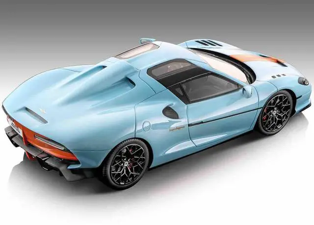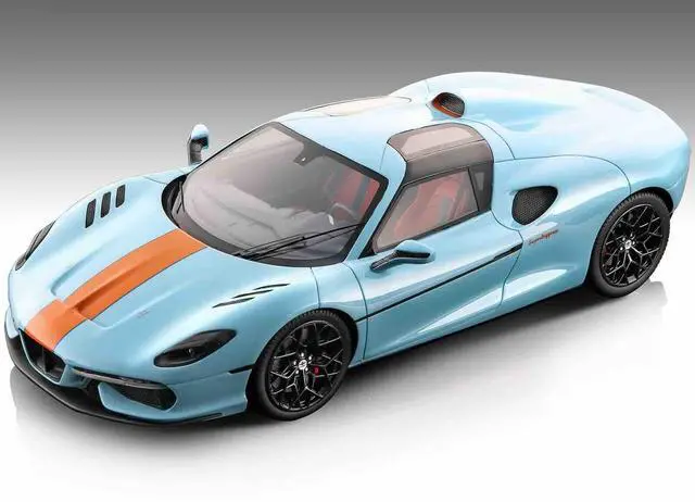 Brand new 1/18 scale car model of 2021 Touring Superleggera Arese RH95 Light Blue with Orange Stripes "Gulf Livery" "Mythos Series" Limited Edition to 65 pieces Worldwide model car by Tecnomodel.