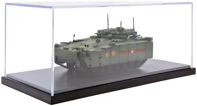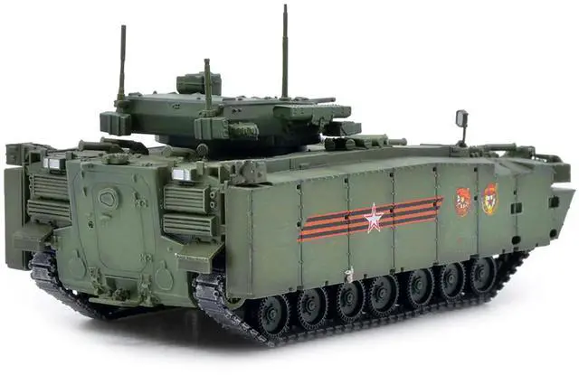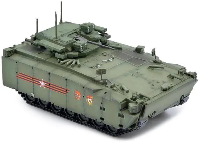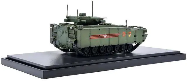 This model of the Kurganets-25 IFV with four Kornet-EM guided missiles is a 1:72 scale replica of the vehicle and is finished in the parade livery. The model is highly detailed and accurate, perfect for collectors and enthusiasts of military history. The Kurganets-25 has not been used in any conflicts yet, but it has been used in various exercises and drills to showcase its capabilities and test its performance. It is currently in service with the Russian armed forces and it is expected to be used in future conflicts and peacekeeping missions.