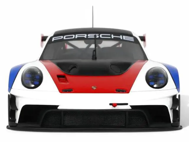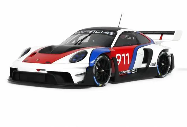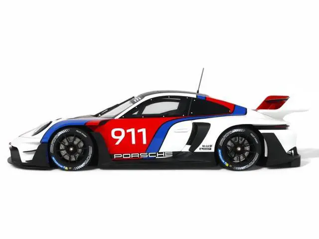 Brand new 1/18 scale car model of 2023 Porsche 911 (992) GT3 R Rennsport White with Black Top and Red and Blue Graphics model car by GT Spirit.