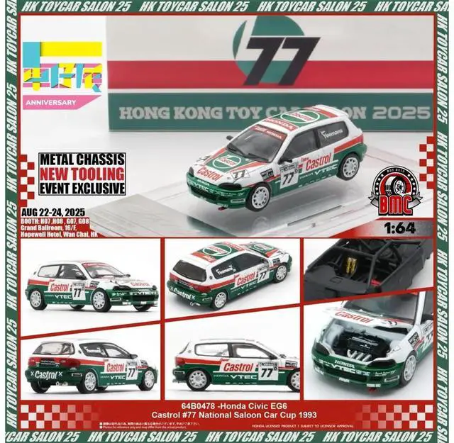 Brand new 1/64 scale diecast car model of Honda Civic EG6 RHD (Right Hand Drive) #77 Team Castrol "National Saloon Car Cup" (1993) die cast model car by BM Creations.