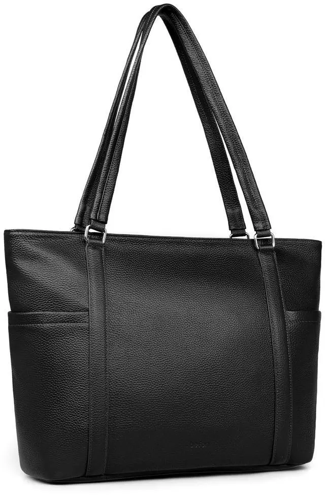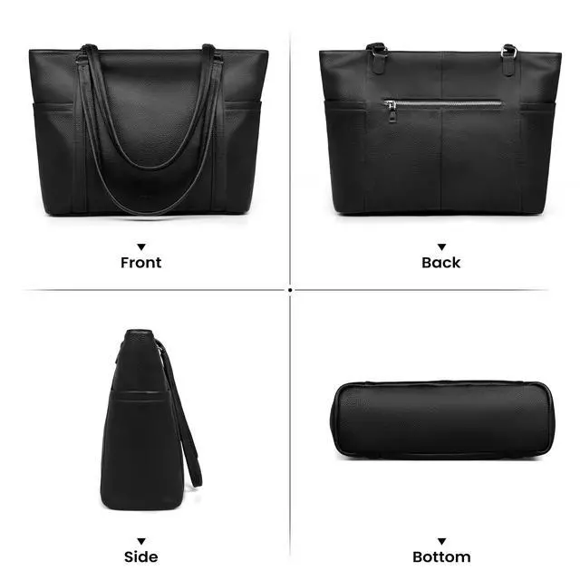 work tote bag for women, will quickly become to your go-to bag for work and travel. There are several pros of this totes. 1,Spacious and Versatile: This bag offers ample space, making it perfect for carrying all your daily essentials, including your 14-15.6 inch tablet, notebooks, and even a small makeup bag or a small crossbody bag. The multiple pockets help keep everything organised. 2,Quality Material: The genuine leather is not only stylish but also durable. It has held up well against daily wear and tear. 3,Comfortable to Carry: The leather shoulder strap design is a game-changer. It distributes the weight evenly, making it comfortable to carry, even when fully loaded.The length of shoulder strap is perfect, you could put it over your shoulder or carry it as a handbag. 4,Functional Design: The zipper of main pocket and the side accessories slots. They add to the bags functionality and security. Big Side Slots helps you quickly easier access your essential. 5, This tote bag is spacious, it could fits your 14 or 15.6 inch laptop,and the thick pad protect your tablet from Impacting in business trip ,commute or travel.It could used as a laptop bag. 6, A lot of detail design, such as the design of the pen slot pockets, cell phone slot, very suitable for work and everyday, very thoughtful.