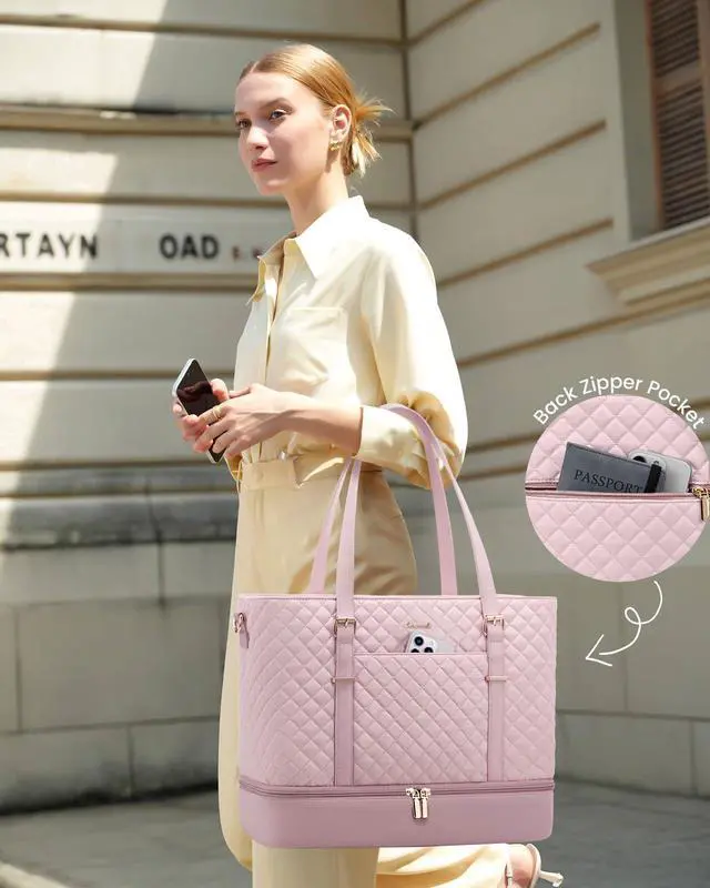 Dimensions: 17.9''(L) x 8.2''(W) x 14.3''(H) Strap drop from top to zipper: 10.5' Weight: 1.6 LBS. Introducing the Elegant Quilted Laptop Tote, the perfect blend of sophistication and versatility for the modern woman. Designed with refined style and practicality in mind, this tote meets the demands of work, travel, and everyday life. Featuring an innovative insulated lunch compartment, this bag allows you to enjoy fresh meals on the go, keeping them at the right temperature with its water-resistant, easy-clean fabric. Never compromise on meal quality again. The spacious interior boasts multiple organizational pockets, including a padded 15.6-inch laptop compartment and an iPad sleeve to keep your devices safe and secure. Additional slip pockets and pen slots ensure your essentials are always organized. Convenient and stylish, the dedicated Stanley bottle pocket holds your favorite drink securely, while the elegant quilted polyester exterior promises a lightweight, water-resistant finish that combats everyday wear. Ideal for professionals, college, and travelers, this tote bag transitions seamlessly across various settings. Whether as a personal purchase or a thoughtful gift, its versatile design and elegant aesthetics appeal to every taste. Upgrade your accessory game today with our Elegant Quilted Laptop Totea must-have for those who appreciate style, functionality, and convenience.
