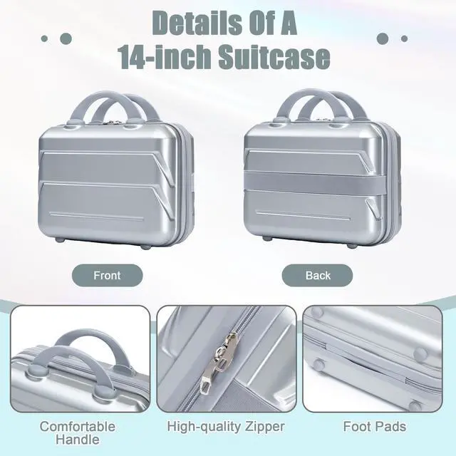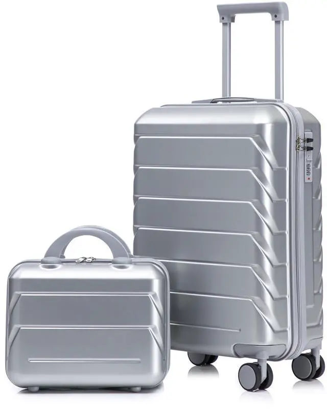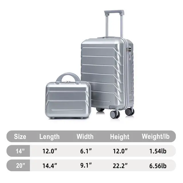 14"/20" 2 pcs/set in ABS Spinner Wheel Luggage, with Combination Lock,14" Cosmetic Case (Silver)