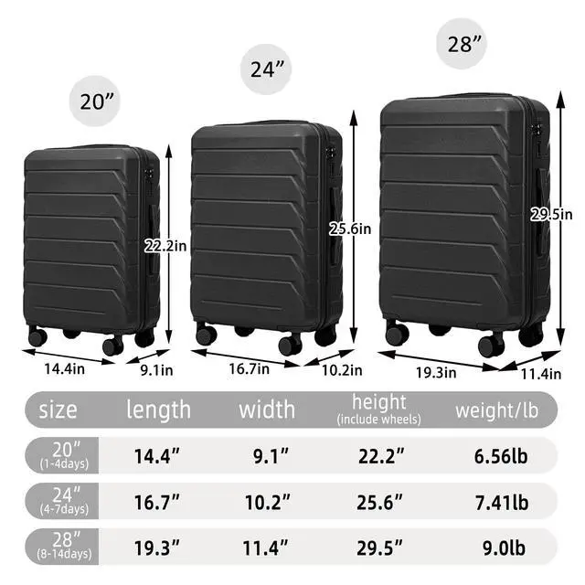 • 20"/24"/28" 3 pcs/set in ABS Spinner Wheel Luggage, Matching Color , With Combination Lock (Black)