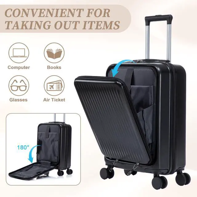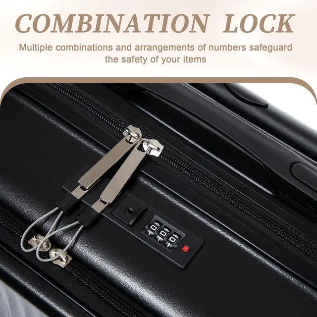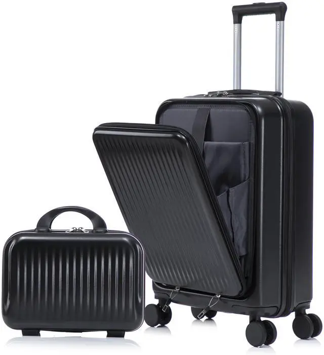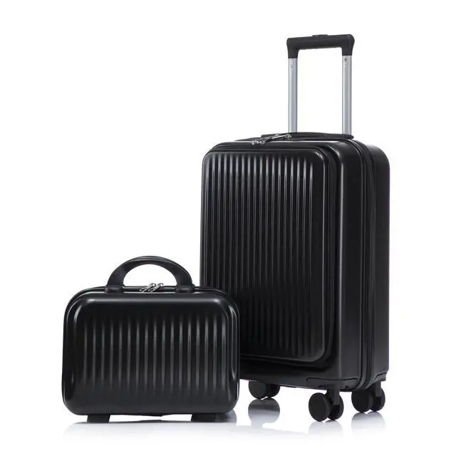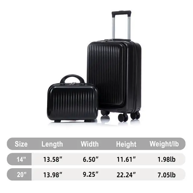 14"/20" 2 pcs/set in ABS Spinner Wheel Luggage, with Combination Lock and Front Opening Design, 14" Cosmetic Case (Black)