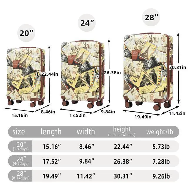 20"/24"/28" 3 pcs/set in PC Spinner Wheel Luggage, Carry on Suitcase, With Printed pattern and Combination Lock (City Stamps)