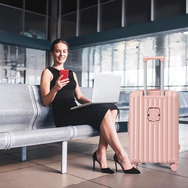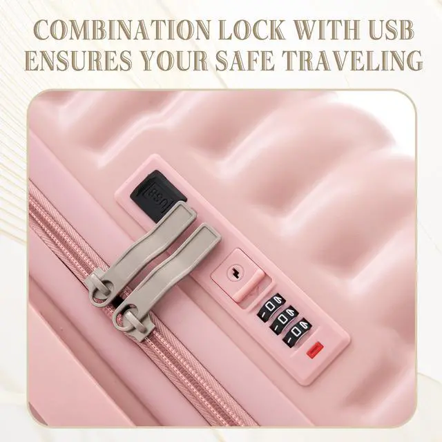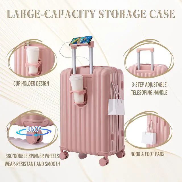 • 20"/24"/28" 3 pcs/set in ABS Spinner Wheel Luggage, Carry on Suitcase, with Cup Holder & USB Port & Phone Holder (Pink)