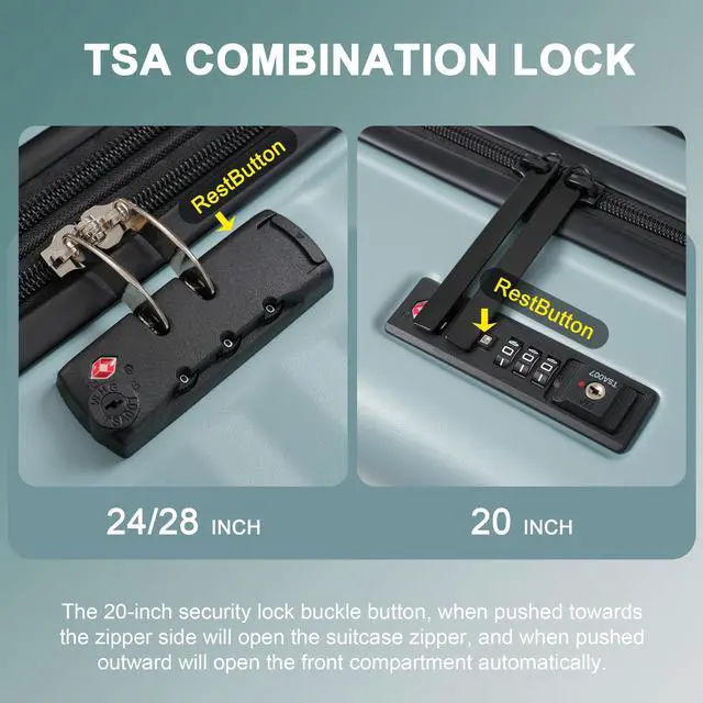The 20-inch security lock buckle button, when pushed towards the zipper side will open the suitcase zipper, and when pushed outward will open the front compartment automatically.