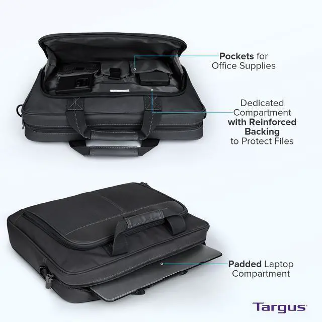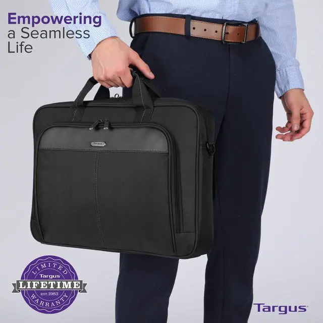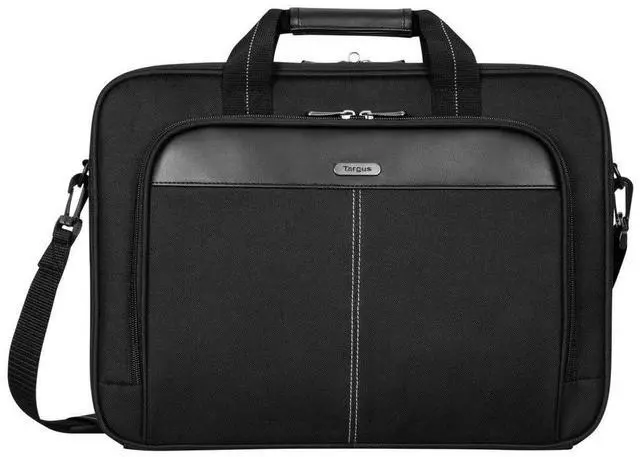 Targus 15-16" Classic Slim Laptop Bag is both slim and lightweight, perfect for on-the-go professionals. Features multiple practical compartments, padded shoulder strap, and high-grade construction, this computer bag helps protect your device while you're on the move. The spacious design has larger pockets for files, a padded laptop sleeve, smaller slots for notepads, power bank, etc., and a dedicated exterior document pocket on the back. Various carrying options include a padded grab handle, adjustable padded shoulder strap, and rear trolley strap for connecting to your luggage or roller bag. Classic Slims foam padded laptop compartment fits most 16" laptops and smaller. High-quality padding protects your laptop and portable devices from shocks, bumps, drops, scratches, dust, and a lot more! The overall density is just the right amount for providing maximum protection. Targus computer and laptop bags will be your go-to travel and workplace buddy for years. Top-grade polyester exterior is reinforced with premium stitching, contoured metal zipper pulls, polyurethane-coated bottom, and durable soft padding are all part of the long-lasting and lightweight design. Classic Slim laptop carrying case can be used for anything and everything! Carry files, business cards, keys, storage drives, power bank, laptops, tablets, and other on-the-go essentials. Whether commuting to work, heading to the coffee shop, or traveling for a conference, this is the laptop briefcase you need.