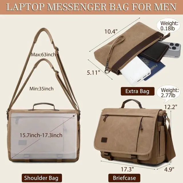 [ 17.3" LAPTOP BAG DIMENSIONS ] The external dimension of this briefcase is 17.3"L * 4.7"W * 10.2"H (2.77 pounds). Extra bag is 7.8"L *4.8"H (0.18 pounds). This messenger bag inner padded laptop sleeve fits up to 12.9 inch-17.3 inch laptop/tablet/computer. Not fit for larger computer. Note: Please measure your laptop before order!