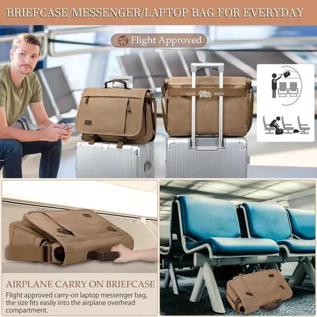 Men: 2PCS Laptop Work PU Leather Canvas Briefcase Carry On Large Computer for Office College Travel (Brown)