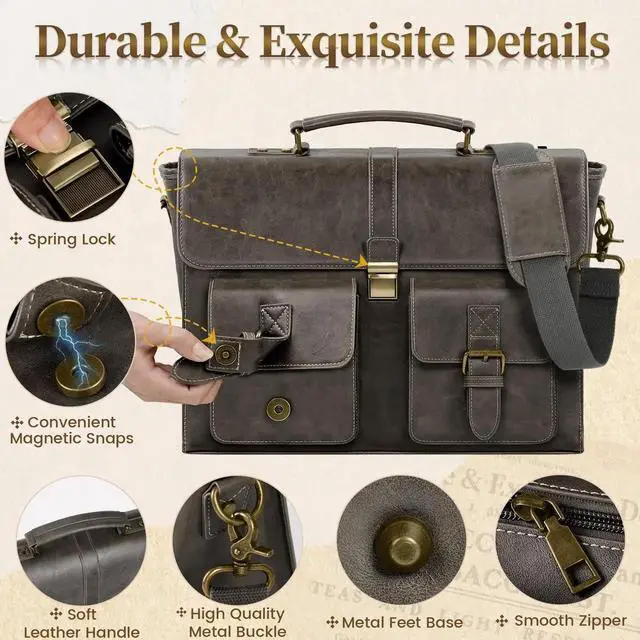 RAINSMORE Mens Messenger Bag 15.6 Inch Leather Vintage Laptop Briefcase Waterproof Computer Laptop Bag Leather Satchel Bag Large Shoulder Bag for Office Work Travel College, Grey