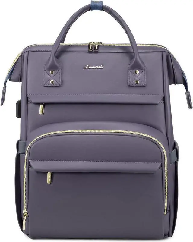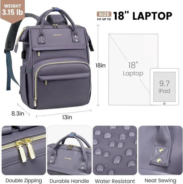LOVEVOOK Leather Laptop Backpack for Women 18 inch, Travel Backpack Purse Nurse Teacher Backpack Computer Laptop Bag, Professional College Business Work Bags Carry On Backpack with USB Port, Grey Purple