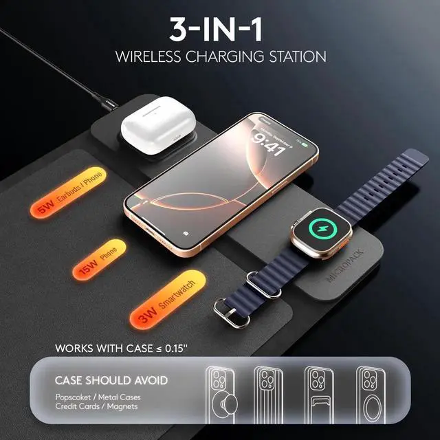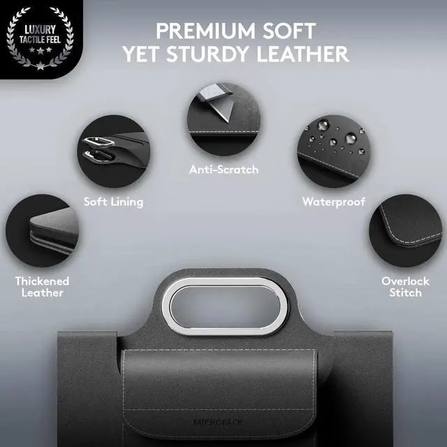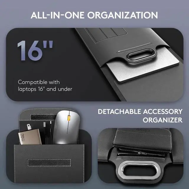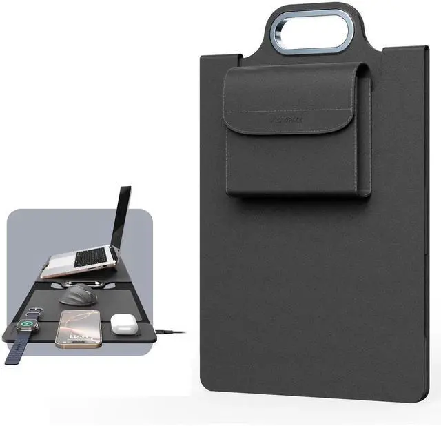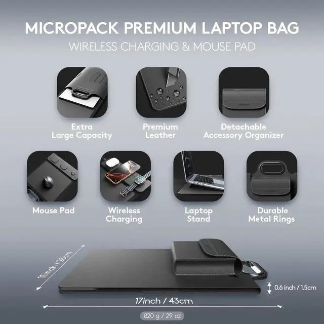 MicroPack Laptop Sleeve with Wireless Charging, Built-in Detachable Accessory Organizer and Metal Handle, Mouse Pad and Stand, Leather Laptop Bag for 15 Inch MacBook/HP/Dell, Watch, Headphones - Black