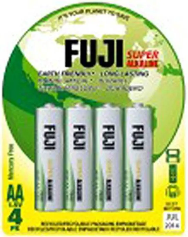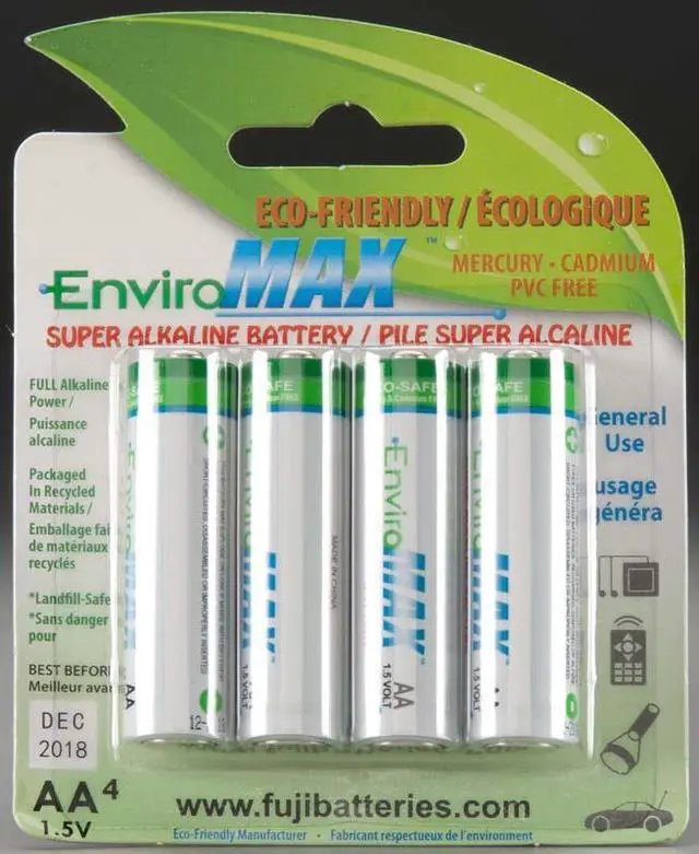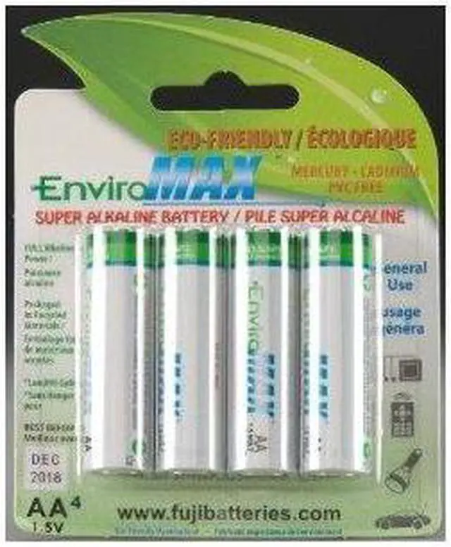 From Fuji comes environmentally respectful yet powerful batteries--the EnviroMax Super Alkaline Batteries! This 4 pack of AA batteries is designed for digital and high-drain devices and exceed industry standards with their 10-year shelf life. Nor are they packaged in non-recyclable PVC plastic. Instead, Fuji EnviroMAX batteries are made in some of the world\\'s most environmentally friendly battery plants, operating under some of the most strict standards of environmental responsibility. In fact, most of all resources used in the Fuji EnviroMAX manufacturing process are reused and recycled! Plus, independent tests show Fuji EnviroMAX batteries equal--and most often exceed--the performance and longevity of equivalent major brands. . 1.5 volts . 10-year shelf life with date-coded packaging . Designed for digital and high-drain devices . Mercury-, cadium- and PVC-free . Labeled and packaged with recycled paper and PET plastic . 4 pack