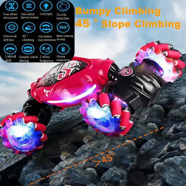 Amazing Gesture Sensing Stunt Carstunt remote control car combines many functions in one, e. g. dazzling colorful lighting and music effects, on-road & off-road dual mode switching, automatic demonstration, one-click deformation, flexible twist the body at multiple angles, gesture command, cool stunt, 360°rotation, double-sided running. With cool features and visual effects, gesture sensing car gives unprecedented operating experience and unlimited fun to boys and girls.