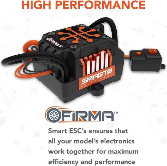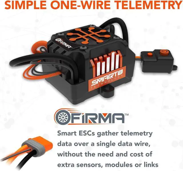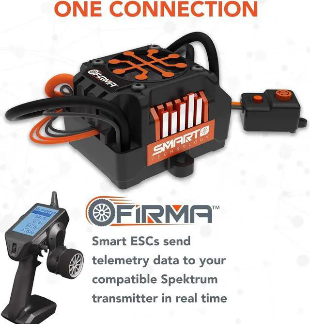 "Like every component in the Spektrum Smart ecosystem, Firma Smart ESCs combine ""plug-and-play"" simplicity with the ability to communicate with other Smart electronics together, creating the best-performing RC system for your vehicle imaginable. Firma Smart ESCs do much more than regulate power. They function like a virtual engineer inside your model, providing a direct path to the vital operating data you need to reach peak performance. Firma Smart ESCs give you an extra layer of confidence that your electronics are all operating at their best. With Firma Smart ESCs, you'll be better connected to your vehicle than ever before without installing extra components that all work independently of each other. You won't need extra wires, modules, or links. A Firma electronic speed control provides a one-wire solution for obtaining telemetry data such as RPM, temperature, battery voltage and capacity. Firma ESCs not only gather the data but also send it to your transmitter in real time, instead of only storing it for after-run study. You're able to adjust settings as needed to boost performance on the go. The Firma Smart single-wire telemetry solution has been tested for quality and performance by the best brands in RC.