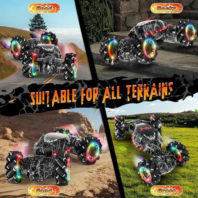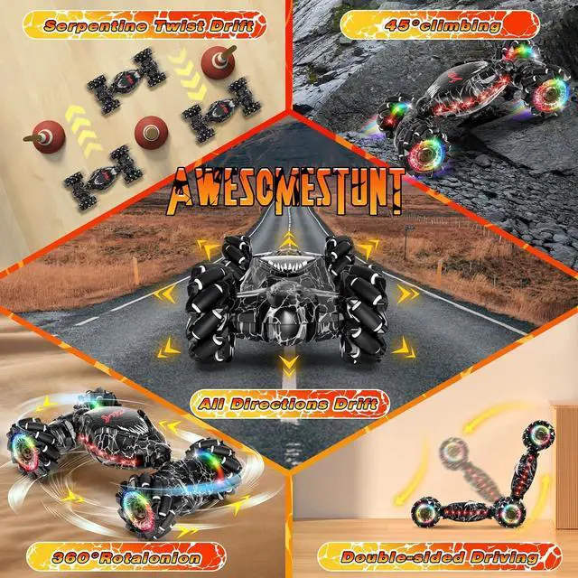 [4WD ROTATION TOY CAR] - The 4WD Double-Sided Rotation Toy Car is powered by a robust 4WD motor, offering all-round mobility with forward, backward, left turn, right turn, lateral drift, and 360° double-sided rotation for flexible control and free will. The RC Stunt Car also has an automatic demonstration function. Press the demonstration button to automatically showcase amazing stunt performances, immersing children in the fun of driving and a visual feast.