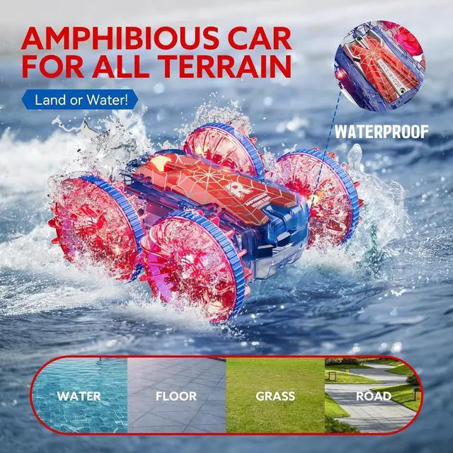 Waterproof Amphibious Car for Water and Land Play--Enjoy this rc car everywhere, like swimming pool, indoor floor, backyard grass, beach, pond or other places else. Waterproof seal installed on the battery compartment cover prevents water going inside and damaging battery or internal parts when playing in water. Make sure the battery cover is TIGHTLY CLOSED when you play in water in case water goes in.