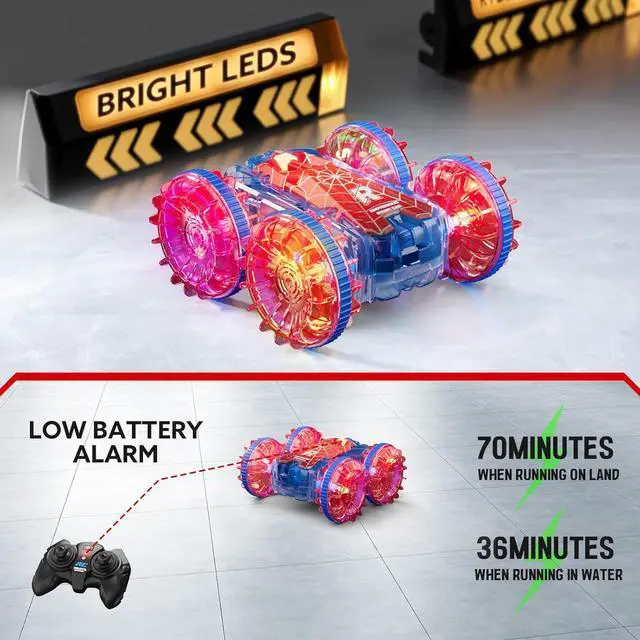 70 Minutes Play Time--2 batteries come with the car, that provides 70mins play time (35 mins per battery) on land; if in water, the play time would be 36 mins (18 mins per battery). When the car battery is low, the car lights and remote indicator light will flash at the same time to remind you to bring it back. This low-voltage warning will help avoid losing your car in a pond due to low power. What more battery charge is short and easy. Wait for 60 minutes, and youll be able to play with a fully charged battery again.