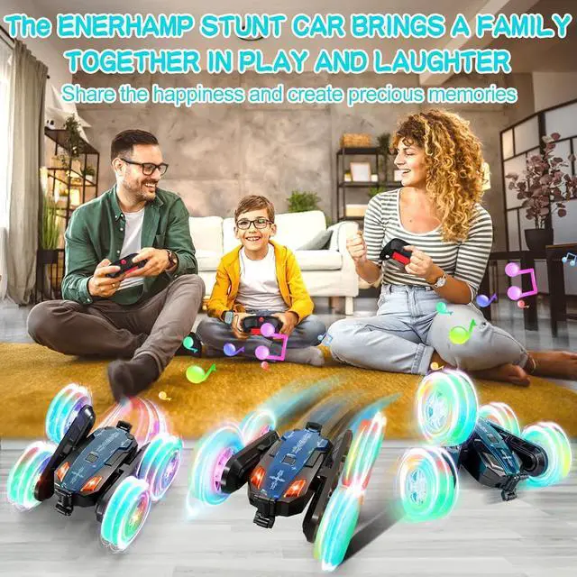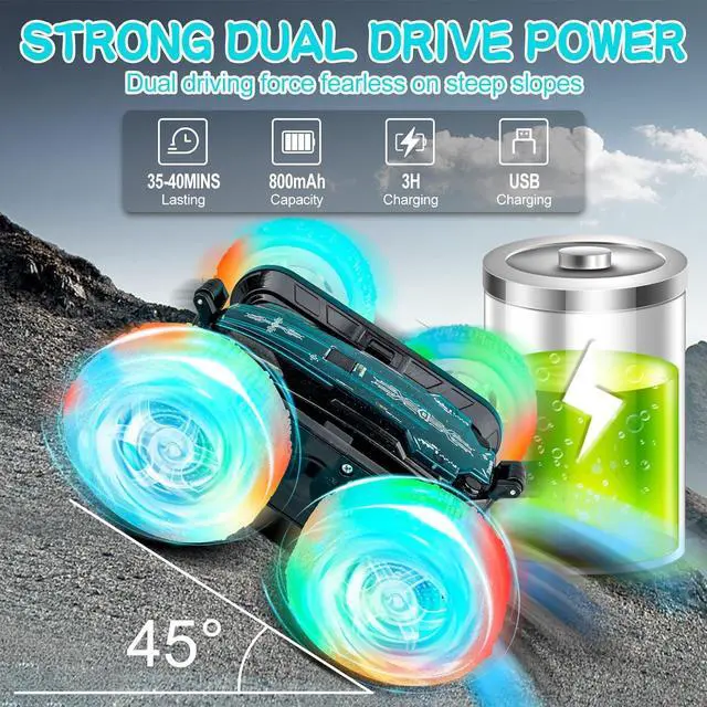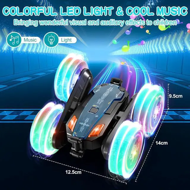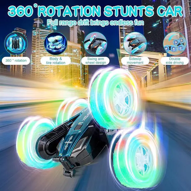 A Great Gift for Boys and GirlsThe cool features of remote-controlled stunt RC cars are perfectly designed for children, with lighting, music, drift, and rotation functions that can satisfy all their fantasies about toy cars. This stunt car is an ideal gift for children or friends on holidays such as birthdays, children' s days, Halloween, new year, Christmas, etc. It is perfect for boys and girls over 4 years old, providing them with hours of entertainment.