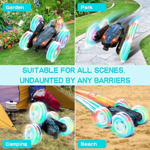 RC Car with Cool Lights & MusicThe four wheels of the remote control stunt car are equipped with bright and colorful LED lights, making the car particularly dazzling during the day and night, indoors and outdoors. This 4-7-year-old boy' s remote-controlled car also comes with cool music when driving, so it looks very cool. The cool features and endless fun can bring children a wonderful operating experience and visual and auditory effects.