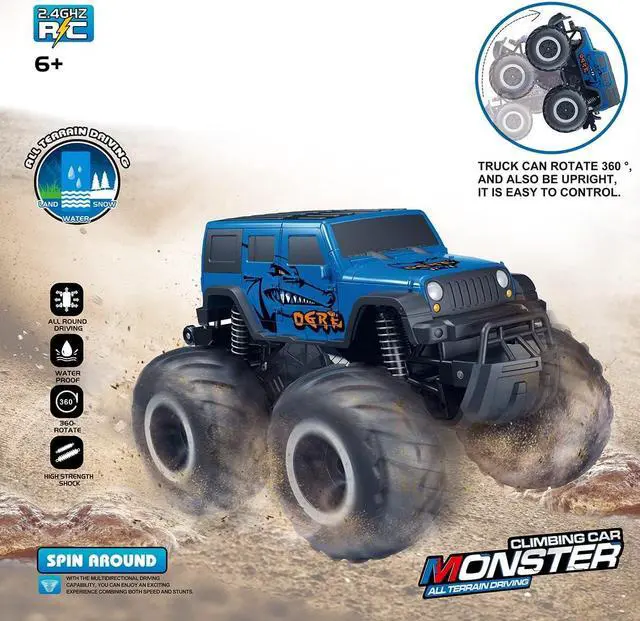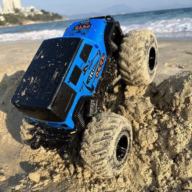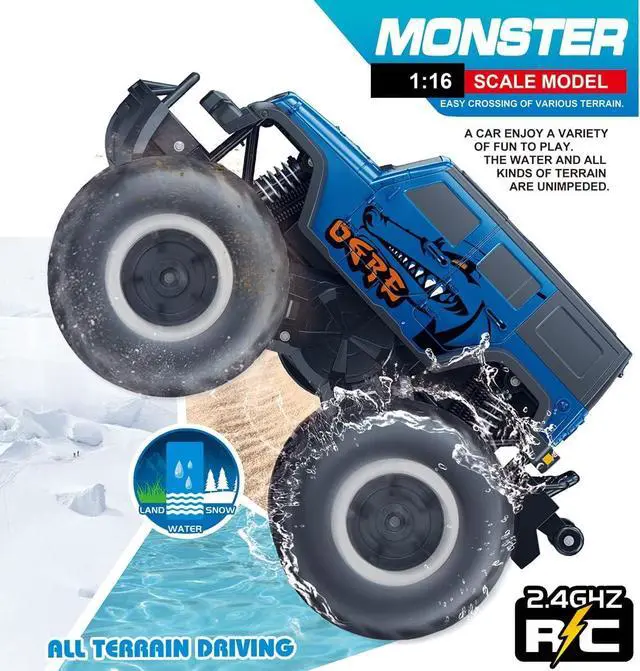 RC SUV TOYS: In addition to the basic skills that ordinary remote control cars should have, the pick-up body is waterproof, so easily runs over a variety of complex terrains, like the seaside, beach, even in the water. Will offer an exciting and versatile experience for kids. Nice presents for kids ages 6 to 12. /// The Remote is not waterproof!!