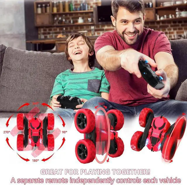 VERSATILE PLAYING OPTIONS: With its 360° rotating stunt capabilities, this race car can be played indoors or outdoors, on different surfaces such as grass, sand, or even rocky terrain. Double sides running, moving forward, backward, turning left, right, double side roll, 180-degree tumbler flip and 360-degree spin for a different playing experience. Each 500 mAh rechargeable battery supports the electric car playing for about 25 mins