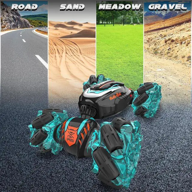 All-Terrain Drifting: 4WD high-tech RC stunt car can drift in all directions, flexible to walk by sideways, rotate in 360 degrees. The remote car is equipped with powerful motors and crash-resistant tires, allowing it to conquer all terrains - sand, grass, dirt, rocks, and more. Suitable for indoor and outdoor adventures, providing children with thrilling and exciting experiences.