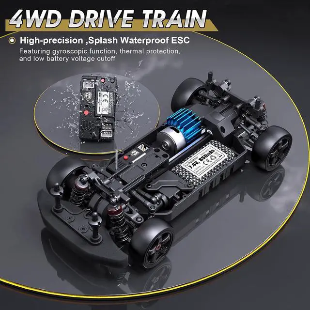 ESP Electronic System: Possessing ESP electronic system with a built-in gyroscope, this vehicle is specially designed to enhance drifting stability. The application of double sealed ball bearings and metal pivot balls in the 4wd rc car construction contributes to smoother movement and efficient transmission, which makes this remote control car stand out.