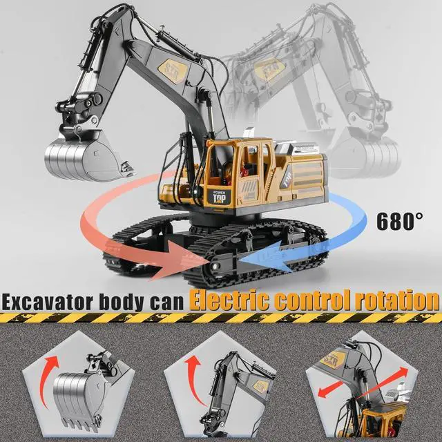 14 Channel Full FunctionalThis remote control excavator can moves forward, backwards, right, left, 680 degree left and right rotation and turns 360-degree in the situ, basically each unit can be controlled individually. Metal digging head can digs loose sand like a real thing. Auto demonstration also help little kids better operate and increase their interest in construction toys.