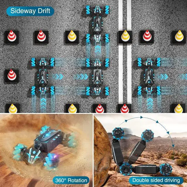 Full-Featured Stunts Car- Real 4WDOur 4WD RC Stunt car can switch between on-road and off-road dual modes, automatic demonstration, one-key deformation, omnidirectional movement, even sideways drift, 360° double sided rotation, climb hills in 45° increments, multi-angle flexible body twist, etc., give unprecedented operating experience and unlimited fun to boys and girls.