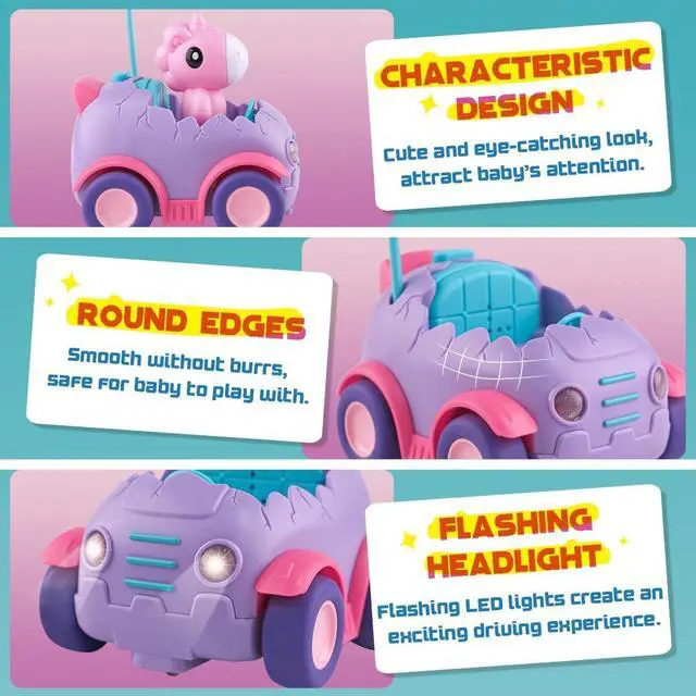 Adorable Shape Cartoon Remote Control CarThe remote control car set included an adorable egg shaped car and a removable action figure with 3 fun musics and flashing headlights. Made from high-quality material, smooth round edges and burr-free, durable and safe enough for baby to operate