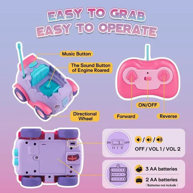 Easy To ControlThe cars are easy to control through 2 big directional buttons to move forward and backward. 3 fun musics can be change or pause by pressing the music button. The toddler remote control car requires 3 AA batteries and the remote control requires 2 AA batteriesnot included. Place the batteries in both vehicles and controllers and watch your toddlers have endless fun