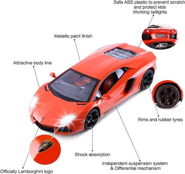 Officially licensed by Lamborghini 1/14 scaled back on the real Lamborghini Aventador LP700-4; Lamborghini model car measures 13.4 x 6.3 x 3.3 inch; Color comes in orange.