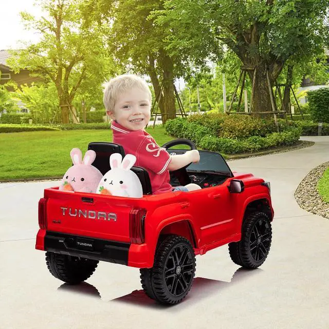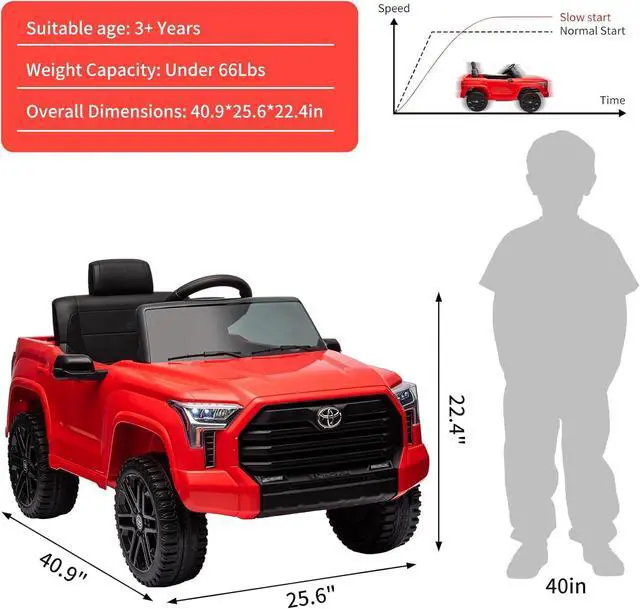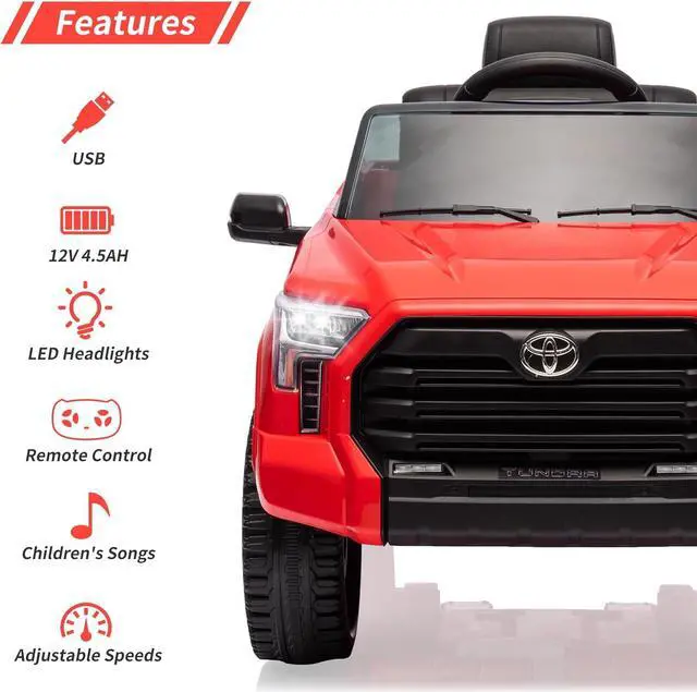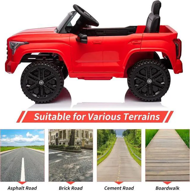 Stylish Design: Officially Licensed Toyota ride ontruck, this ride-on car has a sleek and realistic appearance. It features LED lights, startup sounds, wear-resistant wheels, storage space, an MP3 player, and a flash drive port. The doors fully open and close, adding to the authenticity of the driving experience.