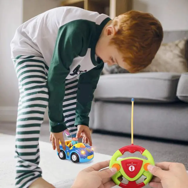 EASY TO CONTROL: 2 Channel remote control for forward and reverse left. Super cute and easy to use, this cartoon car comes with a steering wheel shaped RC controller with only 2 big buttons for simplistic control.