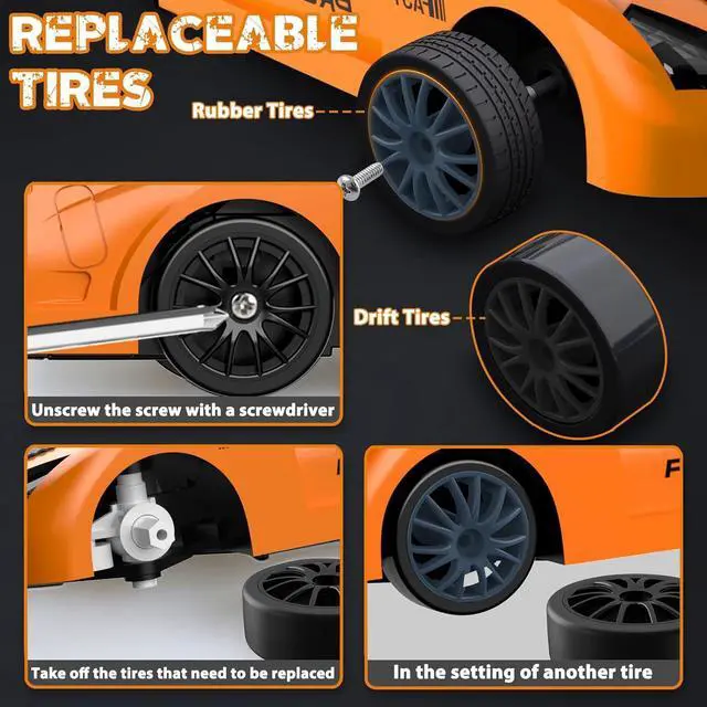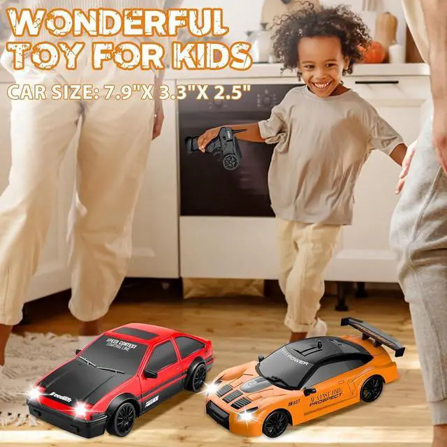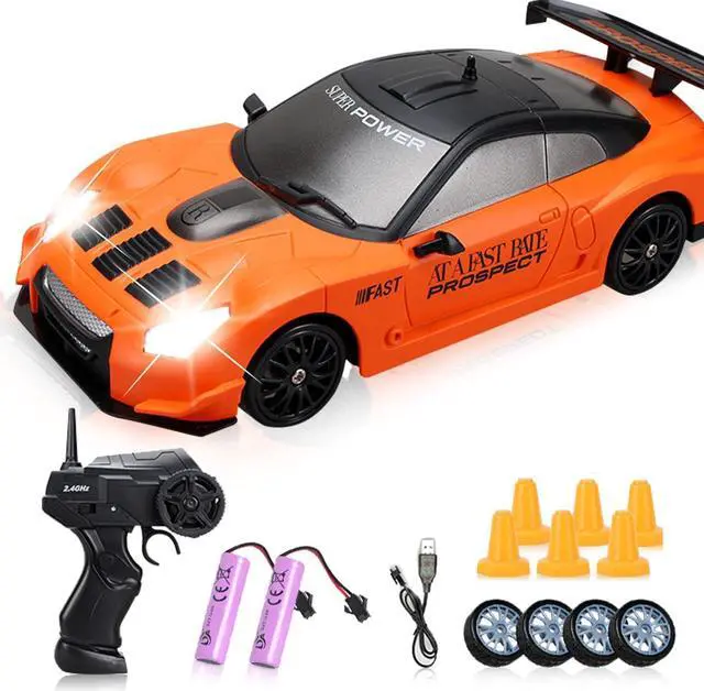 Rechargeable Fast Car: Full function RC drift car with two rechargeable batteries. Don' t worry about being out of charge anymore; Forward, reverse, left/right turn, front LED lights, U shaped drift, fiqure 8 drift, all-wheel drive