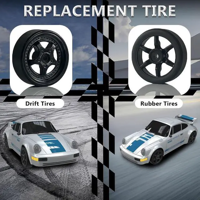 Replaceable Tires: RC drift cars toy comes with double sets of detachable tires, four rubber racing tires and four drift tires. The drift tires allow you to enjoy drifting on smooth boards and track, and the rubber tires allow you to enjoy speed and racing fun in good road conditions. Two tires allow you to easily switch between racing