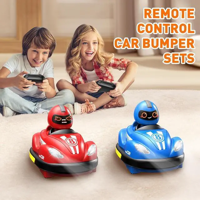 2-Pack Toddler RC Bumper CarsOur kids bumper car toys are suitable for multiplayer games and are great toys for toddlers to develop social skill. The RC bumper car toy set includes 2 cartoon race cars, 2 removable characters, 2 remote controllers(each requires 2 AA Batteries, NOT INCLUDED), 2 sheets of DIY stickers, 2 rechargable batteries (INCLUDED) and 1 phillips screwdriver