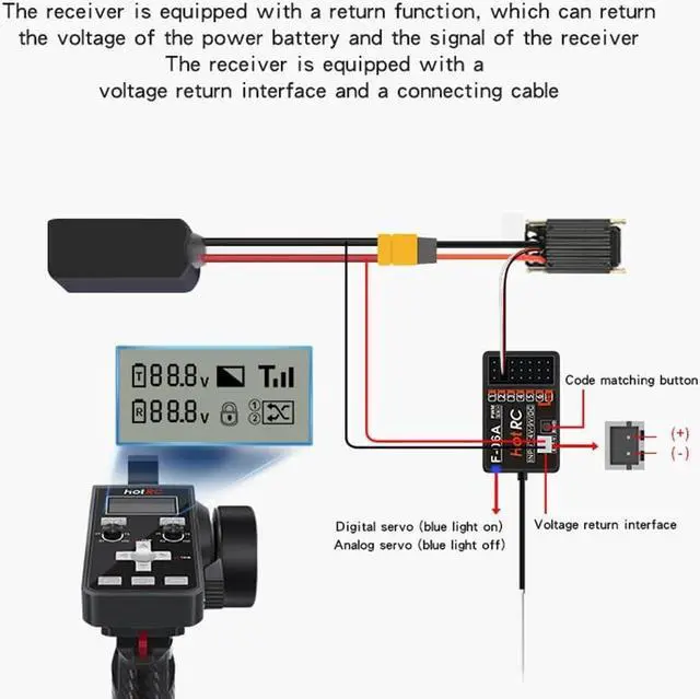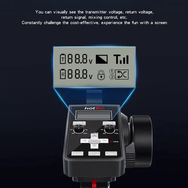 Powerful 6ChannelThis RC receiver with 6CH can be set to runaway protection, 1-2CH can be set to mix control mode, 3-4CH can control Servo, 5-6CH can control light. fine-tuning button can be set to lock.