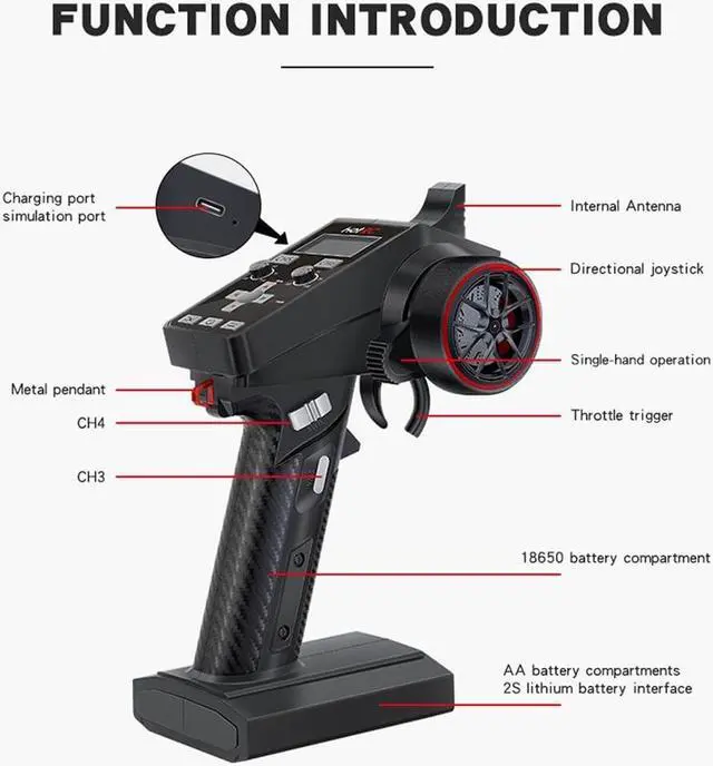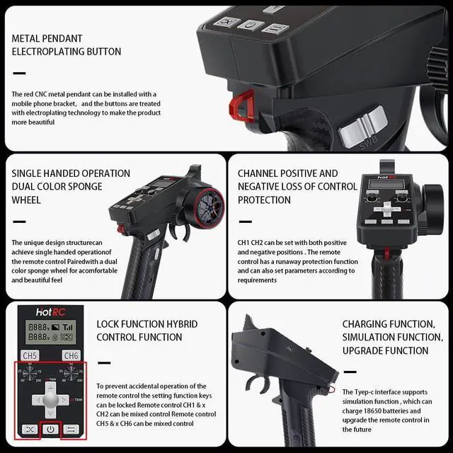 High QualityThe RC transmitter and receiver with standard sponge wheel, exquisite electroplating of the hand wheel, high-grade PVC panel, every detail is finely processed. Comfortable silicone strips on both sides, exquisite leather pattern design, comfortable hand feel, not easy to sweat.