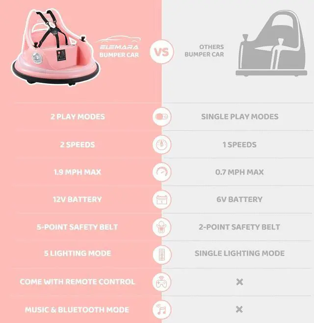 Bumper Car with 1.9 mph MaxELEMARA Bumper Car for Kids allows your child to enjoy top speeds of up to 1.9 mph for unparalleled fun and excitement! Enjoy the thrilling collision experience!