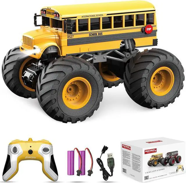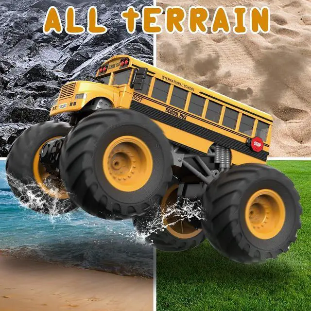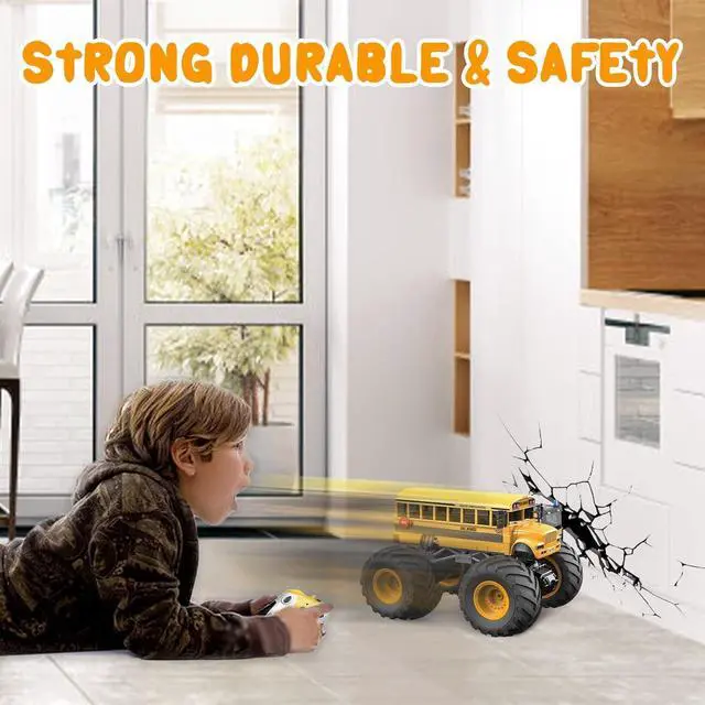 Fine Fire Truck RC Monster Truck: 1: 18 scale RC school bus, remote control car can go forward, backward, turn left and right, other full-scale synchronous control functions. The Remote control is very easy to besimple operation. Power hard shell is not easily damaged by impact during driving. The speed can reach up to 12KM/H, all terrainit can ride on bumpy roads