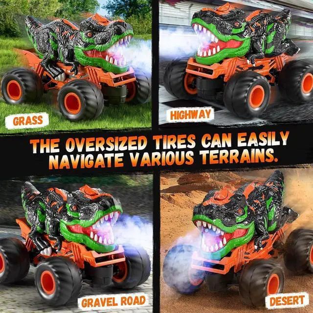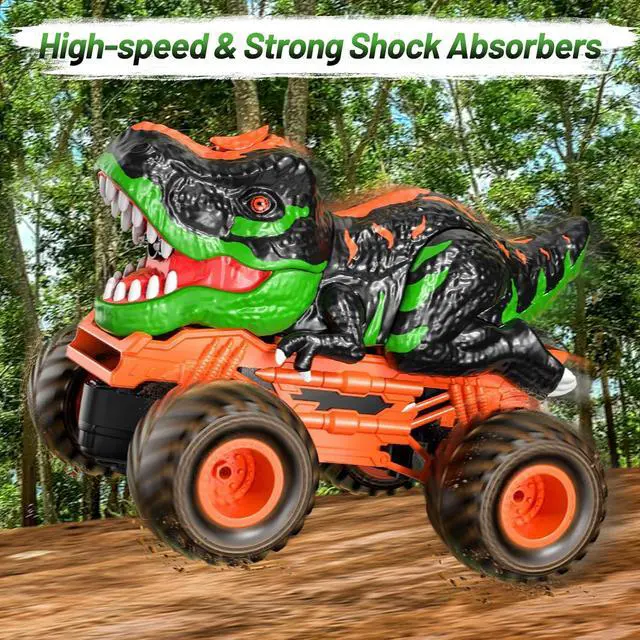 Durable and Rechargeable: Built to withstand rough play, this dinosaur truck is made from high-quality materials that ensure durability. The oversized tires can easily navigate various terrains. Additionally, it comes with a rechargeable battery, eliminating the need for constant battery replacements and reducing environmental waste. 2 packs rechargeable batteries included, 60mins charging time, 25mins playing time.