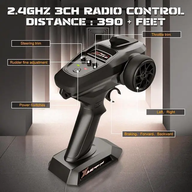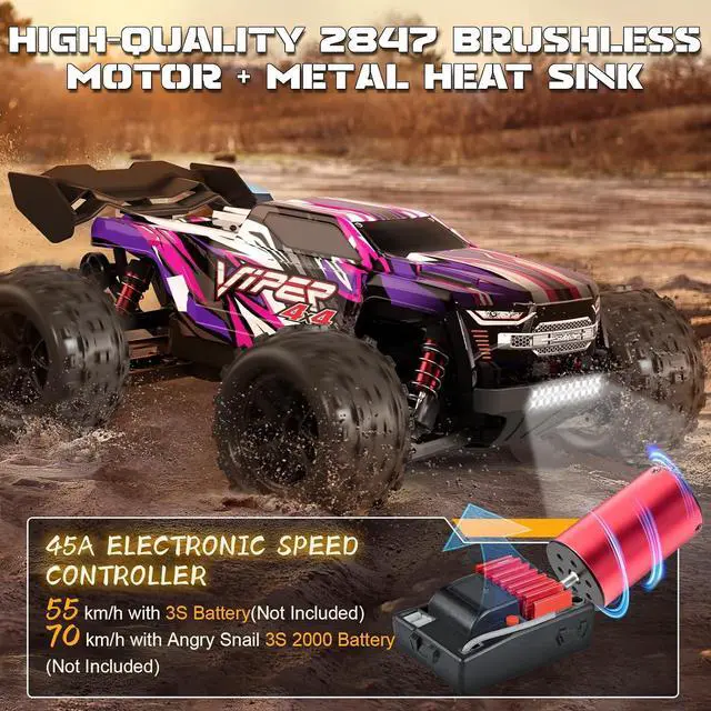 Perfect Compatibility and Easy Control: Our 4x4 high-speed brushless RC truck is compatible with independent intelligent 2S/3S 45A ESC, supporting a 3S power system for ultra-fast speeds of 38+ mph (62 kph) under optimal conditions (3S LiPo battery not included). It also features a normal/slow speed switch, making it beginner and child-friendly. The 120m (393FT) 2.4GH z 3-channel radio transmitter allows for precise control and throttle limit adjustment for new users.