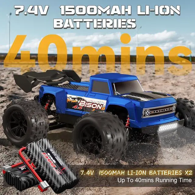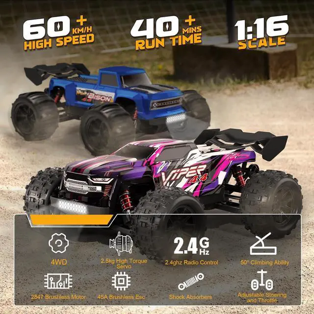 Thrilling Speeds: Our 1:16 scale brushless remote control car features a Hobby 2847 4200KV, 4-pole high torque motor with a metal radiator and cooling fan design. Paired with an independent receiver 45A ESC and a 2S 7.4V 1500mAh rechargeable battery, this car can reach speeds of up to 37+ mph (60 km/h), conquering even the most challenging terrain with ease. (Speed measured via GPS. )