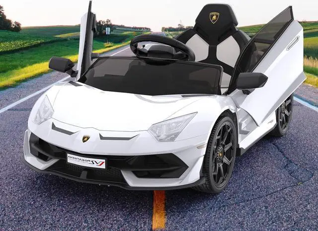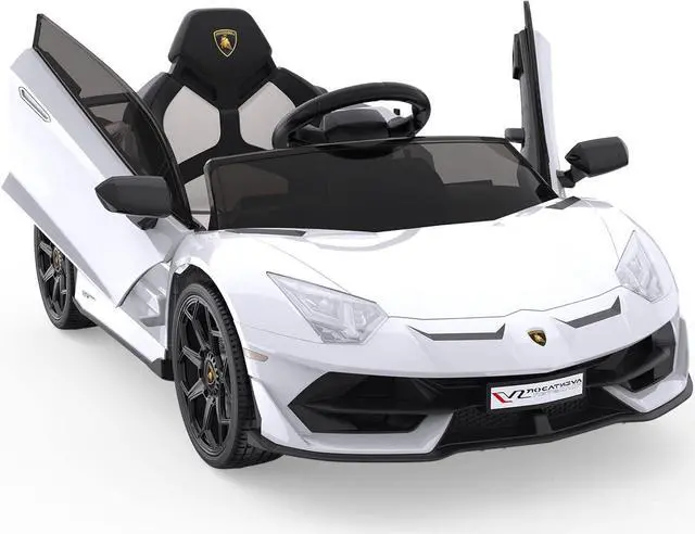 [Licensed Lamborghini] Officially licensed, this Lamborghini ride-on car has LED headlights, horn and engine sounds, and hydraulic powered doors that swing open just like the real Lamborghini. Battery charging time is 8-12 hrs.