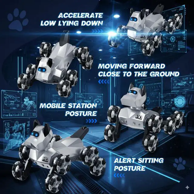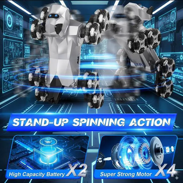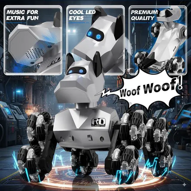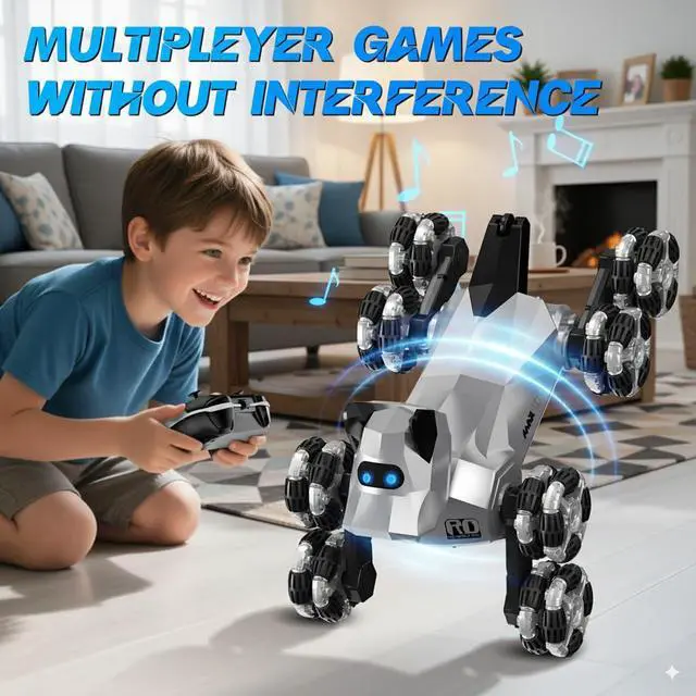 Advanced Mobility & ControlThis high-tech robotic dog merges the fun of RC cars and interactive pets into one dynamic experience. Perform 360° spins, precision drifts, and climbing tricks with eight-wheel drive, plus one-touch demo modes. The 2.4GHz remote offers smooth, responsive commands, while its futuristic design sparks creativity